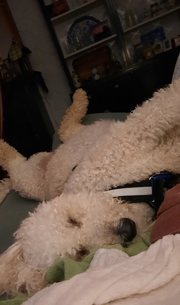 WHY??? Why am I talking about this? Because my sweet doodle, Bonnie, can konk-out in the most epic ways – AND on a dime. One moment bugging the crap out of us to play…next … OUT!
