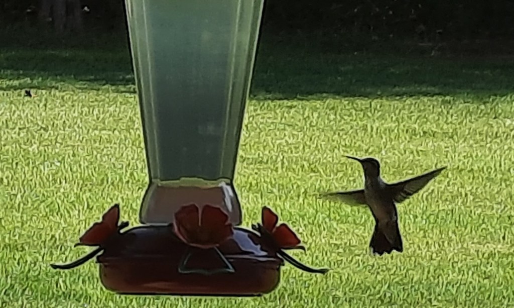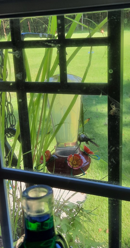 Last summer I learned a very hard lesson in “survival of the fittest.” I always have 3 hummingbird feeders filled from April to late September. We get swarmed with those gorgeous tiny birds during those months and there will be 12-15 females fighting over the best perch on the feeders. The males just do their thing seemingly disconnected from the feisty ladies. In late July I added a trellis outside my kitchen window and put out a hanging plant and a 4th hummingbird feeder. Soon I noticed a praying mantis on the outside kitchen window sill along with a skink, but never together. It was amazing to watch their world happen as I cooked or did dishes. The hummers buzzed the feeder, the mantis swayed with the wind, skink came and went. I came home one day chatting on the phone with my sister, Janine, unlocked the door, unloaded what was in my arms and decided to check out the window to see if any hummers were eating. I screamed in the phone “OH MY GOD!!!” Bless her heart – Janine prob thought someone was trying to kill me. I continued to yell: “SHE KILLED MY BIRD!” Janine kept asking – “WHAT???” I was finally able to compose myself a tad and explained that the praying mantis – while I was gone a few hours – somehow – caught a hummingbird, killed it, and was in the process of eating it. Janine then yelled – “KILL IT.” I sure felt like it, but at that point it was too late. The bird was dead.